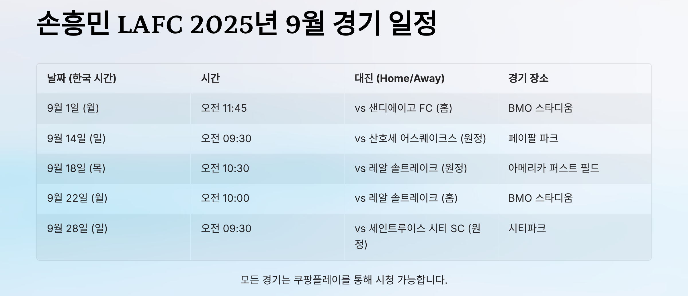 [안내] 모든 경기 시간은 한국 시간 기준이며, 중계는 쿠팡플레이를 통해 시청 가능합니다. 현지 사정 및 방송사에 따라 경기 시간은 변동될 수 있습니다.