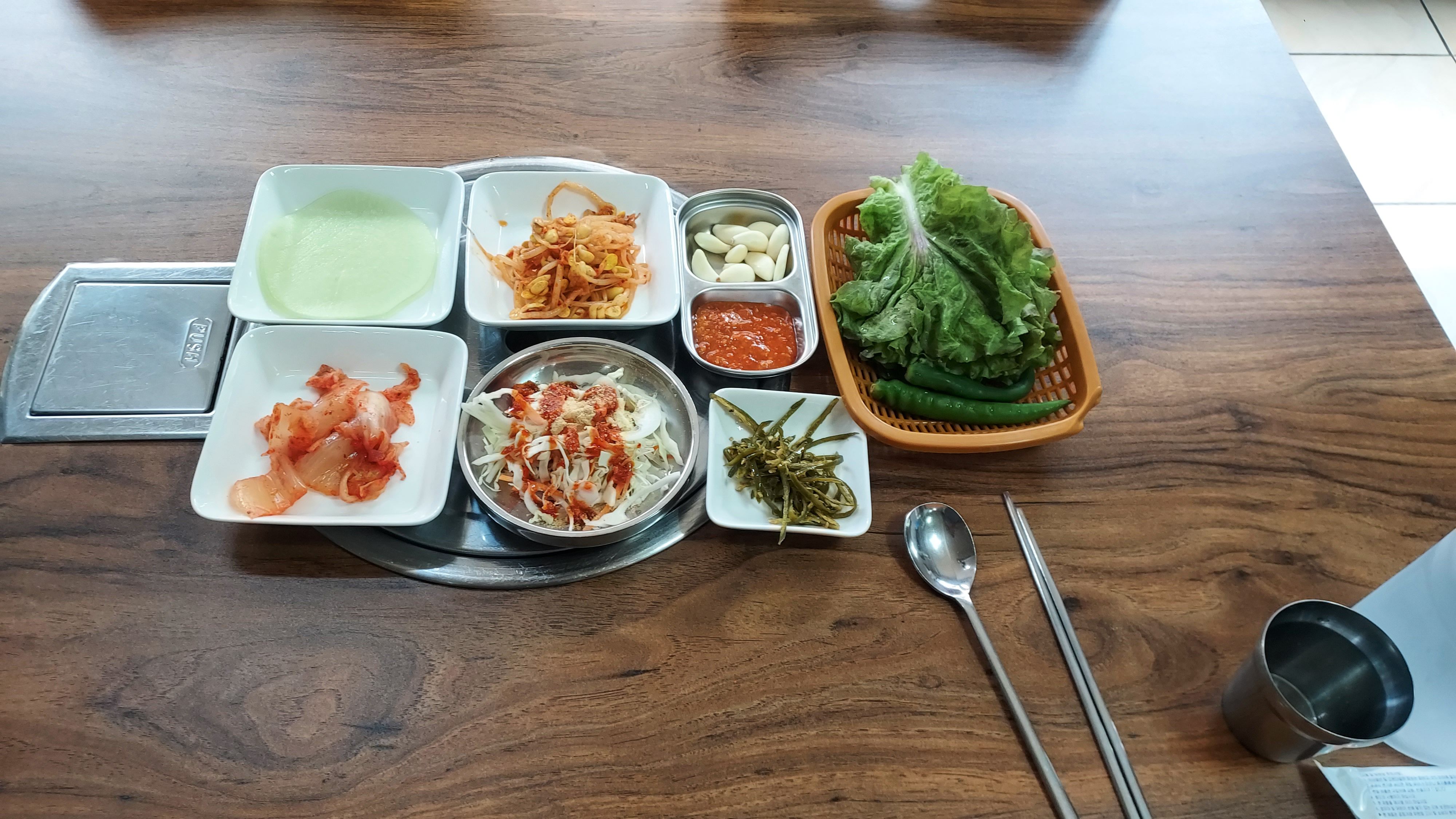 아삭한 콩나물무침과 김치, 새콤달콤한 쌈무, 파채무침, 신선한 쌈채소와 마늘, 쌈장까지!