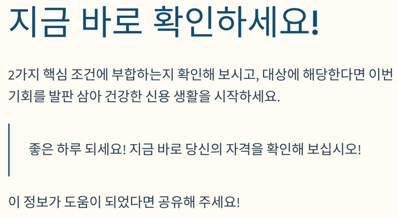 2가지 핵심 조건에 부합하는지 확인해 보시고, 대상에 해당하신다면 이번 기회를 발판 삼아 건강하고 새로운 신용 생활을 힘차게 이어가시길 바랍니다.