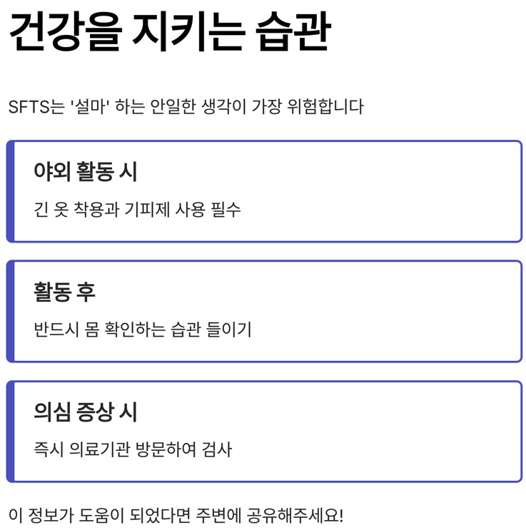 오늘은 '도시 진드기'에 대한 오해와 2025년 SFTS 환자 현황, 주요 증상 및 유일한 대처법인 예방법에 대하여 알아 보았습니다. SFTS(중증열성혈소판감소증후군)는 '설마' 하는 안일한 생각이 가장 위험합니다.