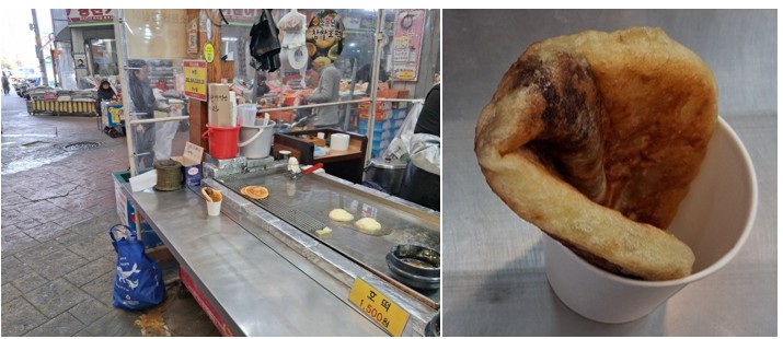시장 군것질 (호떡, 어묵) 추운 날 시장 구경의 묘미는 역시 뜨끈한 간식이죠. 1,500원짜리 꿀호떡과 어묵 가게 모두 '제로페이' QR코드가 있어 온누리 상품권 QR결제로 간편하게 사 먹었습니다.