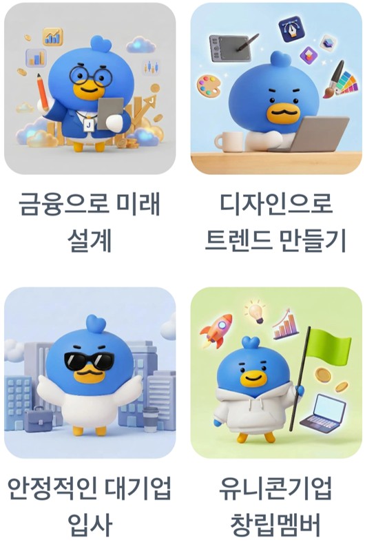 - 분석: 선글라스를 끼고 빌딩 숲 사이에서 여유롭게 커피를 든 캐릭터의 모습은 '높은 연봉'과 '사회적 지위', 그리고 '워라밸'을 모두 갖춘 선망의 대상을 상징합니다. "결국 남는 건 안정적인 월급과 복지"라는 현실적인 공감대가 1위로 이끌 것입니다.