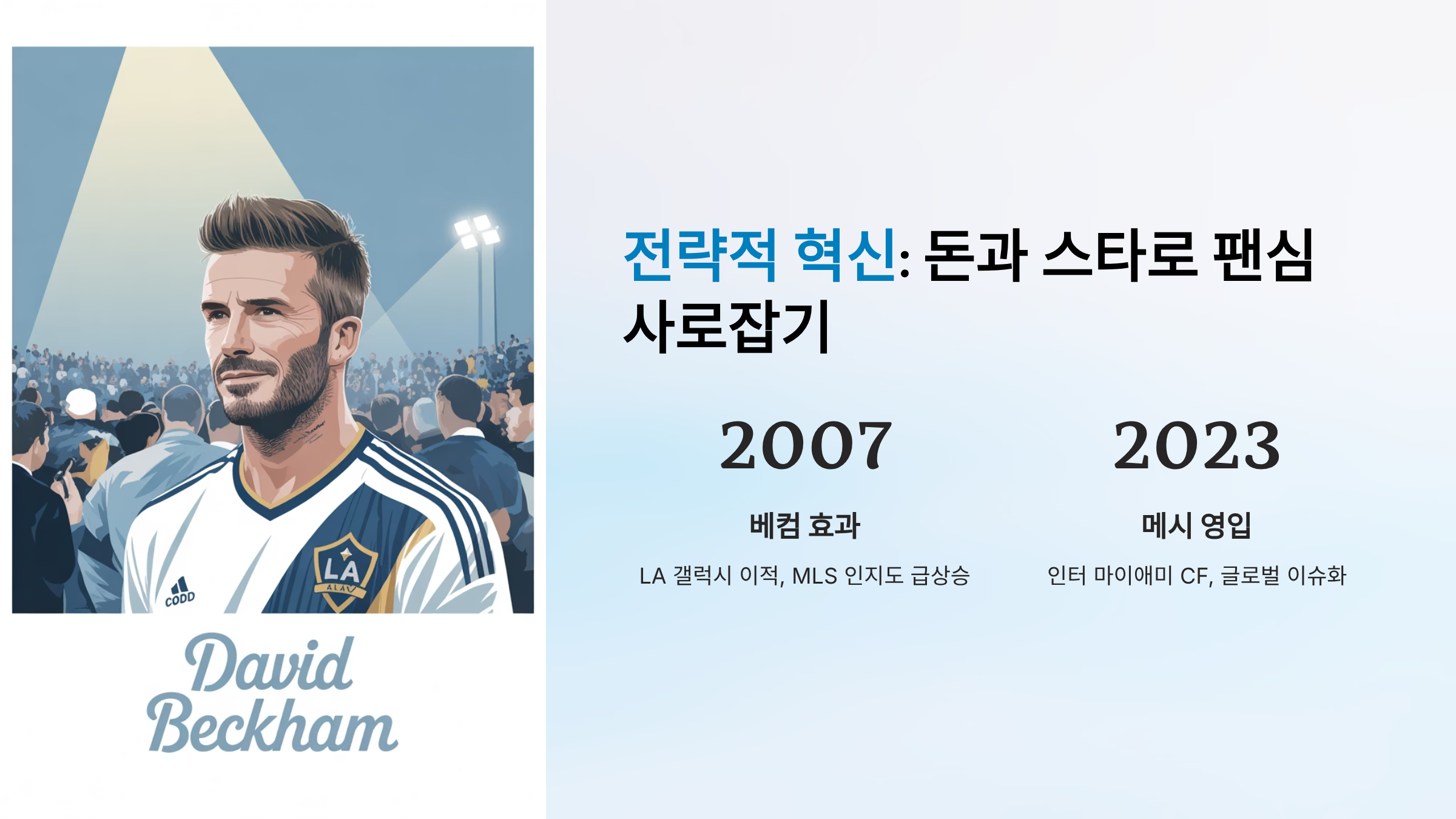 A1. MLS의 가장 큰 성공 비결은 **'전략적 스타 마케팅'과 '커뮤니티 중심의 팬덤 구축'**을 병행한 것입니다. 데이비드 베컴 같은 세계적인 스타 선수를 영입하여 리그의 인지도를 높이는 동시에, 지역 사회와 밀착된 마케팅으로 젊은 층과 히스패닉 등 다양한 팬층을 끌어들여 꾸준히 팬덤을 확장했습니다.