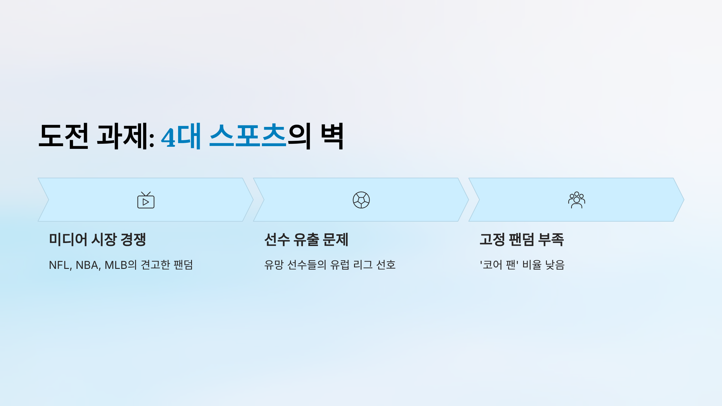 • 고정 팬덤 부족: 축구 팬층이 넓어지고 있지만, 여전히 축구를 '4대 스포츠'만큼 열정적으로 소비하는 '코어 팬'의 비율은 낮습니다.