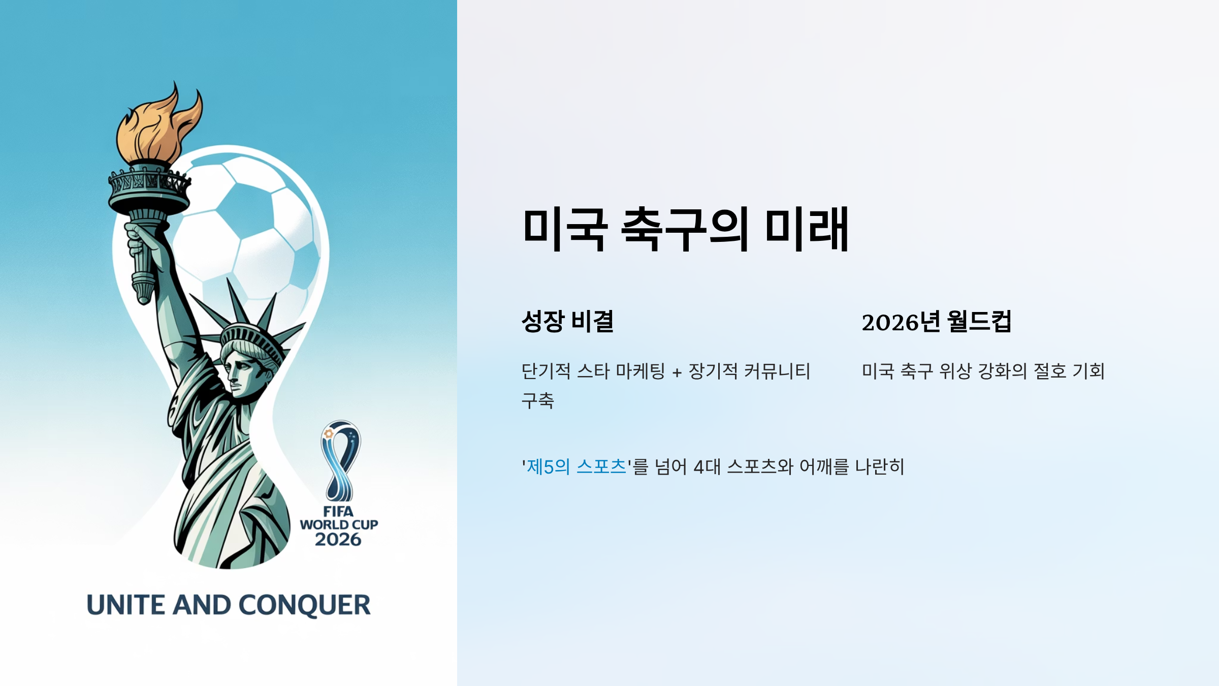 미국 축구의 성장 비결**'단기적인 스타 마케팅'과 '장기적인 커뮤니티 구축'**이라는 두 마리 토끼를 모두 잡으려 했던 전략에서 찾을 수 있습니다. 미국은 2026년 FIFA 월드컵을 멕시코, 캐나다와 공동 개최합니다. 이는 미국 축구의 위상을 한 단계 더 끌어올릴 절호의 기회입니다. 월드컵 개최를 통해 축구에 대한 대중의 관심이 최고조에 달할 것이고, 이는 MLS의 성장과 유소년 축구 저변 확대에 긍정적인 영향을 미칠 것입니다.