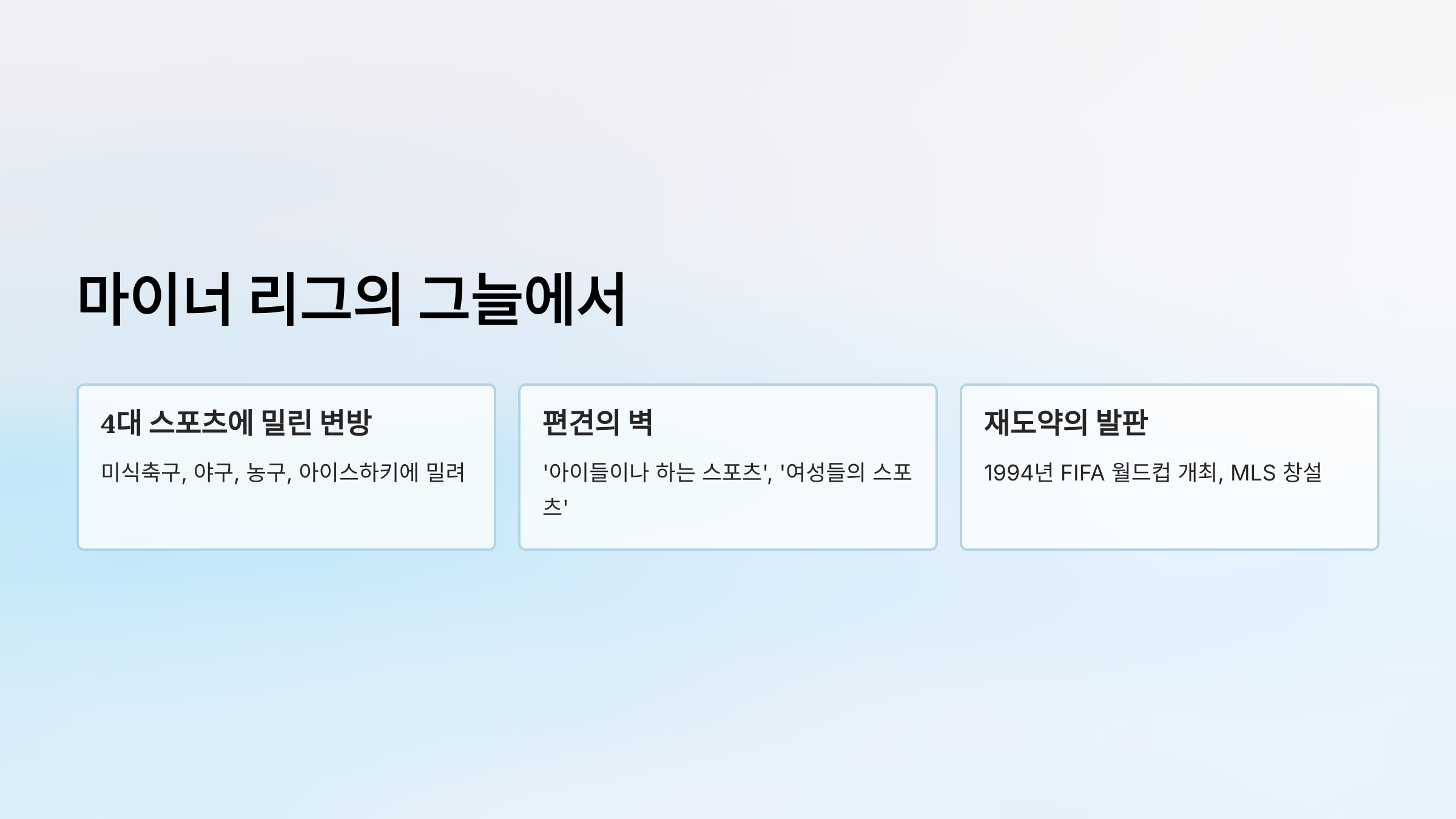 안녕하세요, 구독자 여러분! 혹시 '미국 축구'하면 어떤 이미지가 떠오르시나요? 아마도 야구나 미식축구에 비해 '덜 인기 있는 스포츠', 혹은 **'마이너 스포츠'**라는 인식을 가지고 계실지도 모릅니다. 하지만 미국 축구는 지난 수십 년간 이 이미지를 벗어나기 위해 치열하게 노력해왔고, 이제는 전 세계 스포츠 팬들의 주목을 받는 거대한 산업으로 성장했습니다.
