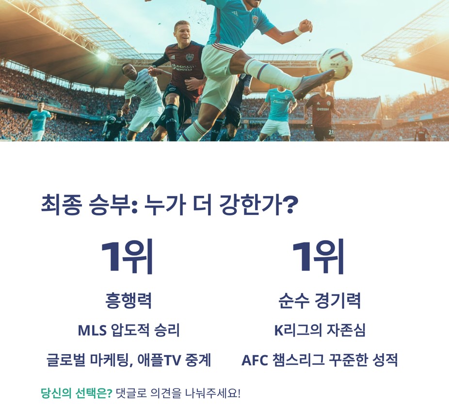 축구 팬들 사이에서 영원히 끝나지 않을 것 같은 논쟁이 있습니다. 바로 "어느 리그가 더 강한가?"라는 질문입니다. 최근 메시와 손흥민 같은 슈퍼스타들이 잇달아 미국 무대로 향하면서, 한때 우리에게 변방으로 여겨졌던 메이저 리그 사커(MLS)의 위상은 나날이 치솟고 있습니다. 자연스럽게 우리의 K리그와 MLS를 비교하는 목소리도 커지고 있습니다.