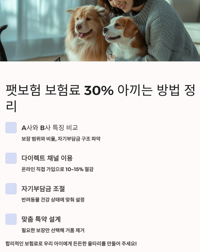 다이렉트 가입과 자기부담금 조절, 맞춤 특약 설계를 조합하면 표준 설계안 대비 최대 30%의 보험료 절감이 가능합니다. 팻보험 보험사비교, 이제 어렵지 않습니다.